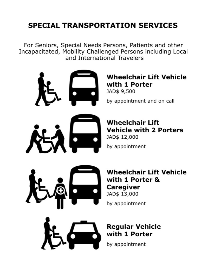 IMPORTANT: All prices for wheelchair vehicle trips are for a maximum of 3 hours within the Kingston corporate area. Prices are in Jamaican dollars.