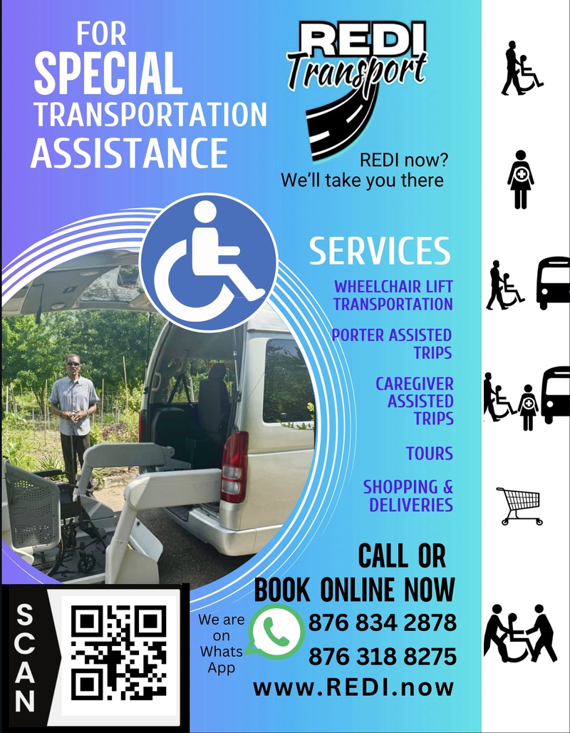 REDI Transport is on time. They are careful about everything, from driving on Jamaican roads to how safely you are seated in the vehicle. You can choose the level of assistance you need for your appointment or trip. I love the gentle treatment and consideration. They really take great care of me!
